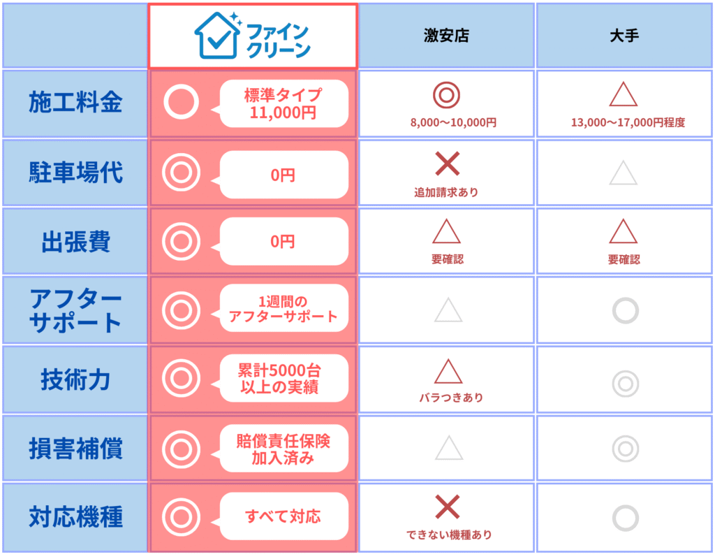 ファインクリーンは「安さ」を売りにしているわけではありません。私たちが追求しているのは、 “適正価格 × 高品質” です。過度な広告や大きな店舗運営など、お客様のサービス品質に直接影響しないコストは徹底的に削減しています。削減できたコストは、作業クオリティと「コミコミ価格」へそのまま還元しています。「しっかりした品質を、わかりやすく、安心できる価格で。」それがファインクリーンの考え方です。